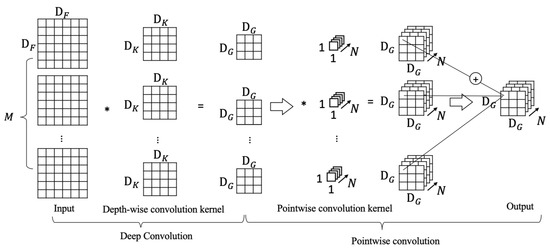 To detect suspicious objects in the site, we adopted a streamlined architecture using depthwise separable convolutions with MobileNet [20]. This is a lightweight and efficient model that reduces the number of parameters, so it meets the real-time calculation requirements. The depthwise separable convolution decomposes a standard convolution into deep convolution (depthwise convolution and 1 × 1 pointwise convolution). Figure 9 shows the framework of the depthwise separable convolution using the input (). The convolution kernel () can produce () output after convolution. The depth separable convolution together with the input size of () and the convolution kerne l () are convolved to produce (). This output is further convolved with the point-by-point convolution kernel () and adds the result of the channel to produce the result (), which is an output of the same channel as the standard convolution kernel. This method has reduced the amount of calculation by eight to nine times. We used LabelMe to manually provide the label of the collected aerial images for the suspicious person dataset. The suspicious objects may appear both in inland aquaculture farms (people) or in the open sea (ship vessels or boats). The data sets were captured involving suspicious persons with various postures in the field, such as walking, fish stealing, and sitting.