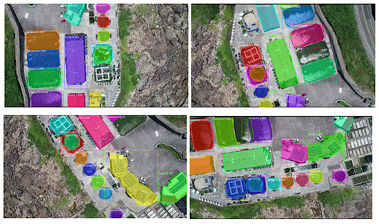 The drone is equipped with a camera and takes RGB images with different views and perspectives. These images captured by the drone are sent to the cloud to perform semantic scene segmentation. This function enables the system to understand the various facilities or objects present in the scene. For surveillance, we integrated a 2D semantic representation of the scene to locate the necessary objects in the aquaculture site. The semantic model represents the visual and geometric information of the semantic object that defines the checkpoints for the inspection work. Each checkpoint is associated with the corresponding GPS signal and altitude of the drone. Figure 12 shows the results for the detection of semantic objects in which objects were highlighted or colored (fish cages, houses, and fishponds) in the surveyed area. This detection capability using Mask R-CNN has 95% accuracy.