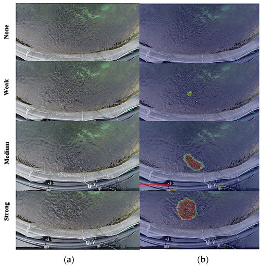 Fish feeding intensity results using four levels of feeding intensity. (a) original image; (b) processed image.