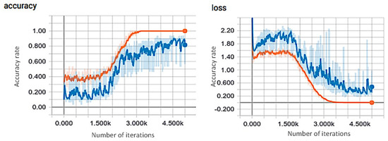 Figure 15 shows the best viewing angle (top view) using 4 m altitude results for the I3D training process for the accuracy evaluation and training loss of the fish feeding-intensity evaluation. The orange line represents the training curve, while the blue line is the validation curve where the training curve converged at 3000 steps. Using the best altitude and camera angle result, we tested the accuracy of our deep-learning model to evaluate fish feeding intensity. In training our deep-learning model, we used the following manually labeled datasets for each fish feeding-intensity level: 90 image sequences for none, 398 image sequences for weak, 373 image sequences for medium, and 401 sequences for strong. Each image sequence contains 80 frames, and 70% of the data set was used for the training data, while the remaining 30% is for the test data.