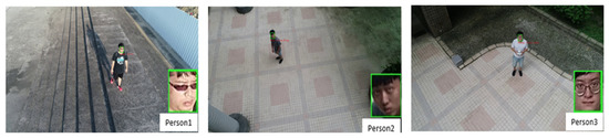 To further confirm whether the identity of a detected person is suspicious or not, the drone will track/follow the person and capture the facial image of that person (Figure 18). The drone sends the captured image to the scene cloud for face recognition using the FaceNet [10] deep-learning model; this will determine if the person is authorized or not by comparing the captured image with the information of authorized personnel stored in the cloud database. Once an intruder or unauthorized person is detected, the system sends an alarm to the user through the drone navigation app. We have used three different altitudes (3, 4, and 5 m) to determine the best altitude parameter for drone image capture. Using 4 m as the best altitude, where we have obtained an 87% accuracy detection rate.