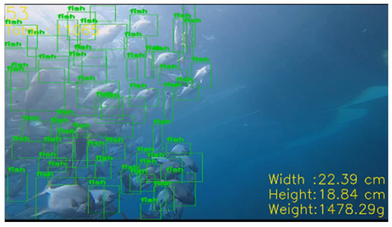 To achieve real-time monitoring for fish, we applied an architecture for fish detection using YOLOV4 [19], which is very popular in terms of speed and high efficiency in object detection. In retraining the YOLOV4, we used 200 images, and each image is labeled with around 110 fish. The batch_size is equal to 8, and the number of iterations is 2000. To determine the number of fish for each frame, we calculated the total number of fish as 30,000, with an actual volume of 11,996.57 cubic meters and a collected image frame of 45,000. We compared the ratio of the average number of fish for each image frame with the total number of fish. To calculate this, we used the following formula: