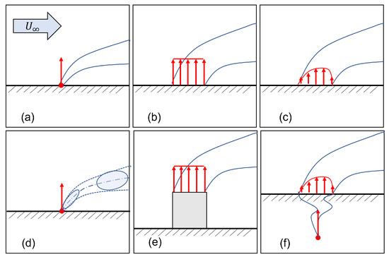 Example illustration for source types: (a) continuous point source, (b) uniform area source, (c) distributed area source, (d) intermittent point source, (e) elevated area source, and (f) underground point source.