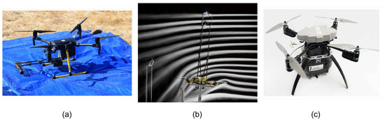Payload configuration examples of (a) boom-mounted TDLAS on a DJI M210 used in [120], © 2020 IEEE, used with permission, (b) top-mounted anemometer in a wind tunnel showcasing the effect of propellers on the streamlines used in [108], and (c) bottom-mounted RMLD used in [121].