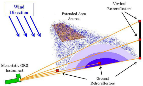 The last Mass-Balance-based approach is vertical radial plume mapping (VRPM). The VRPM approach uses a ground based laser with retro-reflectors at different altitudes downwind of the source. The path integrated concentrations are measured at different radial angles and used to estimate the flux.