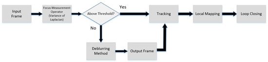 Figure 3) to detect and to reduce motion blur occurrence when compact, lightweight, low cost, easily calibrated monocular cameras are mounted on micro/nano-UAVs. In the proposed framework, Variance of Laplacian (LAP4) is selected as a focus measure operator for detecting motion blur. In the preferred LAP4 method, a single channel of the image is convolved with the Laplacian kernel, and the focus measure score is found by calculating the variance of response. If the focus measure score is above the threshold, then the vSLAM process continues as expected. Otherwise, images are restored by image deblurring methods. Deblurring is applied only for frames below the threshold and not for all frames. In this way, the processing time is kept at a suitable level. It has been observed that the tracking performance is increased, and the tracking loss ratio is decreased in the case of vSLAM algorithms with images restored by deblurring techniques.