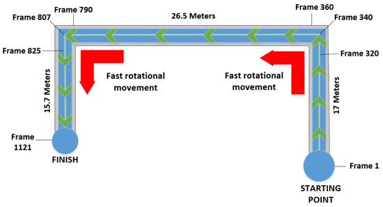 Figure 4, the forward movement is plotted in a green color, and fast rotational movements are shown in a red color. In addition, the starting, finish points and the frame numbers corresponding to the rotational movements are given in the same figure.