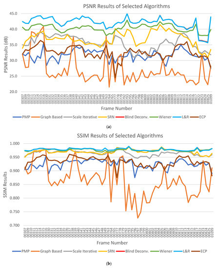 Figure 7. In PSNR and SSIM analyses, it was observed that blind deconvolution and Lucy and Richardson (L&R) algorithms provide similar performance. According to the experimental measurements, the improvement in restored images is the best in these two algorithms.