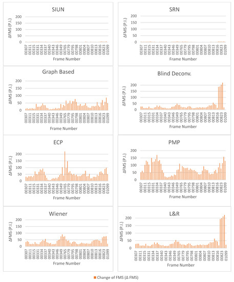 Figure 8. The Wiener and L&R methods also possess relatively higher average ΔFMS value compared to other deblurring methods {BD, GB, SIUN, SRN}. An important remark from the table is that although Wiener and L&R methods have lower ΔFMS than the ECP method, both methods have better performance in the case of rapid rotational motion, which can be deduced from the comparison regarding tables in