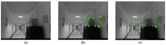 Drone images flying at the height of 140 cm were obtained in the experiment. The platform made a straight motion with an average speed of 1.2 m/s until it reached the corners. In the turns, especially, 90 degrees of sharp and rapid yaw movement was achieved. The dataset was created by obtaining 1121 frames in the corresponding corridor orbit with a forward-facing camera. Processing speed is crucial for the extraction of targeted features from the dataset. For different processing speeds, the motion blur level does not change, but detector and descriptor’s allocated processing time varies. For example, when the processing speed is varied from 20 to 10 fps, the allocated processing time is doubled, and thus more time can be given to complete the process in the relevant frame. Nevertheless, the corresponding exposure time was kept the same for every processing speed and the blurring effect was the same as well. The images in the studied dataset were processed at a processing speed of 20, 10 and 5 fps in ORB-SLAM2 [