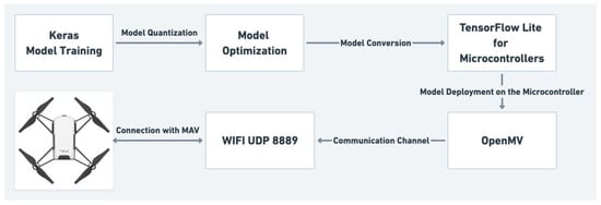 As for the TinyML platform, we chose an OpenMV microcontroller, which acted as a decision unit. The OpenMV platform [] is a small, low power microcontroller that enables the easy and intuitive implementation of image processing applications. It can be programmed using high-level Python scripts (Micro-Python). It is driven by an STM32H74VI ARM Cortex M7 processor running at 480 MHz, which is suitable for most machine vision applications. OpenMV was particularly suitable for our proposed approach due to its low power consumption and weight as OpenMV as a payload would not prevent the drone from taking off. It was also equipped with a high-performance camera that we used to collect data for the mission purposes. In addition, OpenMV was selected to ensure that the drone would be able to take off and operate whilst carrying the relevant payload due to the sharp weight limitations of the DJI Tello drone. Consequently, the energy consumption of the drone with and without the payload was tested to verify that the proposed integration was energy-effective.