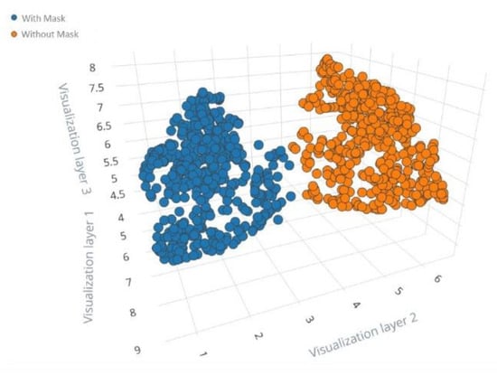 As for the set of data for training and validation, we adopted the open-source Face Mask Lite [] dataset, which is based on generated faces for model training without privacy problems. In Figure 2, we represent the dataset. Even after rescaling and color conversions, image features have a high dimensionality that prevents suitable visualization. For this reason, a dimensionality reduction was applied to reduce the image to a 3D space (the three visualization layers). To train the model, we randomly selected 1000 images, equally divided into images with and without face masks. Each image was resized to 96 × 96 pixels. The number of samples was chosen to comply with the constraints of the selected microcontroller and to optimize the model size.