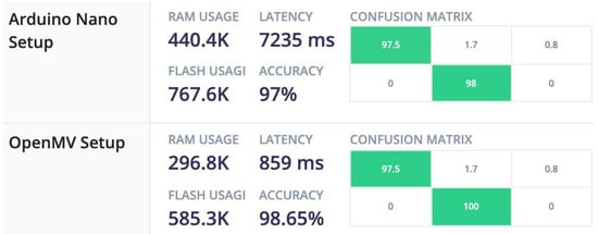 Processing data and confusion matrix for the Arduino Nano (above) and OpenMV (below) architectures.