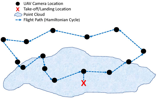 Figure 2 demonstrates the concept of the TSP in the context of UAV photogrammetry. The black dots identify locations where the UAV flies to take a picture and capture a view (analogous to a traveling salesman peddling wares from city to city). The red X marks the take-off and landing location for the drone (akin to a hometown for the salesman). The amorphous blue shape represents the point cloud that is the subject of the SCP as described later in the paper (similar to the terrain/elevation that the salesman travels in a weighted TSP). Lastly, the dotted blue lines provide an example of the minimum flight path that is a Hamiltonian cycle, as would be calculated by the TSP algorithm for the UAV to fly a photogrammetry mission, such as the path the proverbial salesman travels.