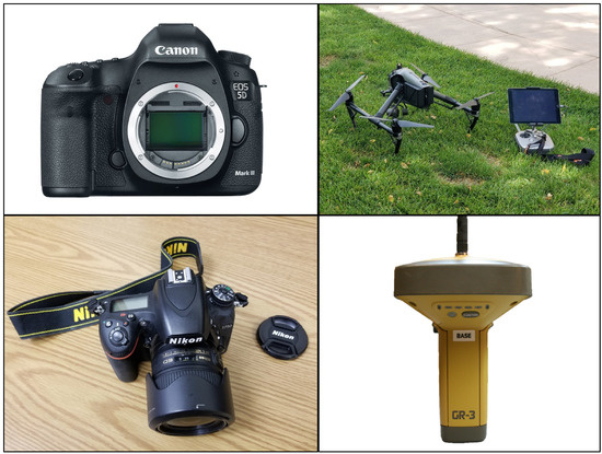 Equipment used for data collection. (Top Left) Canon EOS 5D Mark III, (Bottom Left) Nikon D750 with 35mm lense, (Top Right) Inspire 2 equipped with a Zenmuse X4S camera, and (Bottom Right) A GR3 Topcon GPS receiver.