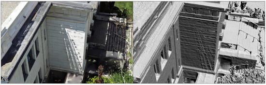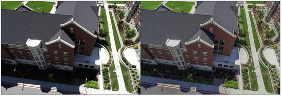 The data collection schedule during the 4 months of acquisition was largely governed by favorable weather. Since SfM modeling relies on the assumption that all objects and lighting in a given situation are static, cloudy days were given preference over sunny ones to ensure equal lighting, less shadows, and minimal shadow drift. Shadow drift occurs when shadows move due to the change in position of the sun during long data acquisition periods when images are captured of the same area during different times/shadow settings. Shadow drift is reflected in SfM models as parallel overlapping shadow boundary lines and can interfere with alignment and accurate model reconstruction (see Figure 4). This effect is minimized by flying during cloudy days when possible and by flying portions of areas in sunny weather only once (one detailed sweep around the target instead of many repeated isolated visits). In the end, not all areas could be flown in cloudy weather and multiple areas were flown in the sun. In addition, the Marriott Center and Miller Baseball and Softball Park were flown at dawn before the sun rose and had less light. Images from portions of the model flown in low light conditions before sunrise suffered some quality deficiencies due to the needed use of increased light sensitivity (ISO), resulting in grainier photos and additional noise, but are not noticeably visible in the final model.