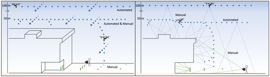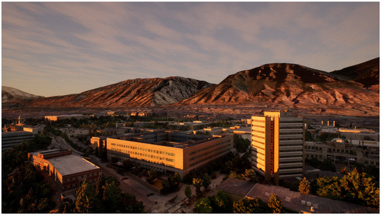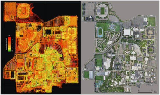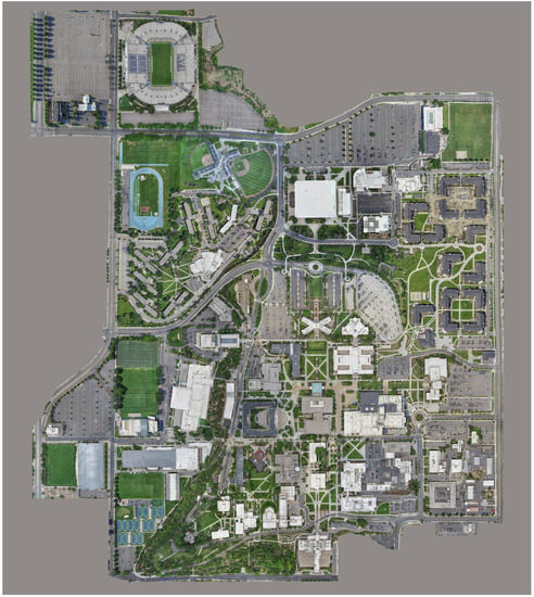 Except for a few select areas, all parts of campus were flown with a GSPro grid for baseline overall nadir coverage (this website map facilitates identifying buildings/regions of BYU campus for individuals who are unfamiliar with the layout: https://map.byu.edu/ accessed 6 November 2021). Most often, this coverage was divided into a high (>100 m) flight over the whole scene and a low (<50 m) flight over areas of high interest such as buildings (see Figure 5). Part way through the data acquisition stage of the project, an oblique camera angle GSPro flight plan was introduced and used for several large regions of campus. These areas were built with a nadir, and 50° camera angle in the North, South, East, and West directions. Areas which included this data collection method were: Heritage Halls, Helaman Halls, the South East campus administrative buildings block, and the BYU Stadium. Additional manual photos and ground photos were added to all of these areas with the exception of ground photos in Helaman Halls.