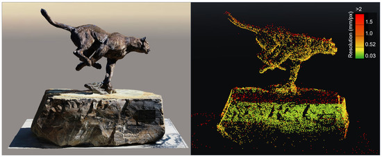 Basic small SLAM-based LiDAR models taken at the same time as the model photographs were compared with areas from the final model via CloudCompare (Section 4.2.3). Although also outside the scope of this paper (similar to the NBV approach by Arce et al. [42]), another interesting route of study could include the density/resolution of a portion of a SfM model that ensures object recognition through means of other software tools.