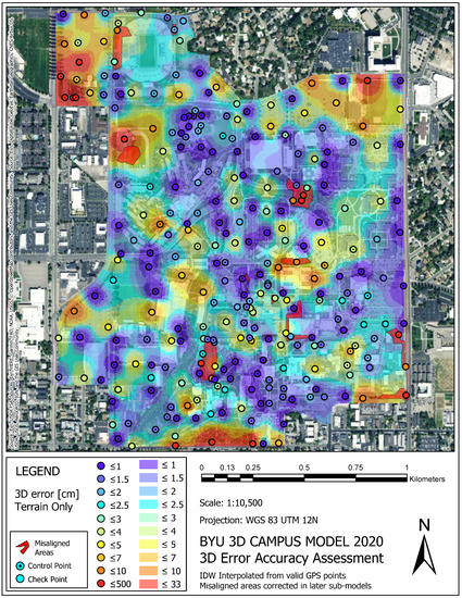 A total of 161 GCPs were taken and used in the model with 118 check points (CPs) taken for the accuracy assessment. Accuracy assessment points were taken May 2021, one year after the original data were collected. Attention was given to be sure that points that were gathered then were also visible in the original model/data.