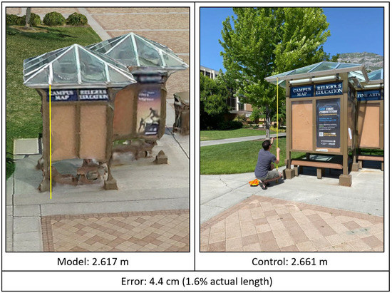 The software capabilities that allow for object recognition allow for creating the large-scale model in the first place. Agisoft Metashape© (see https://www.agisoft.com accessed 6 November 2021) and Bentley™ ContextCapture frequently receive the photos and metadata as inputs, and outputs fully functional SfM 3D models; the models are processed by ready-made standard analyses as well as additional capabilities to manipulate and understand the data/models [35,42,47,58,73,74,75,76,77]. CloudCompare also streamlines analysis of models and point clouds [42,47,57,58,78,79,80]. CloudCompare permits cloud to cloud comparisons, iterative point cloud alignment, point density and resolution analyses, cloning of point clouds for additional processing, and more. Okeson et al. [53] highlights how the density of portions of the point cloud in the SfM model indicate quality of resolution corresponding to higher resolution when the UAV takes photos nearer the ground and lower resolution when the UAV takes photos from further away. CloudCompare demonstrates in Arce et al. [42] that iterative solutions add additional clarity both quantitatively and qualitatively to 3D models in terms of detail to the model as well as increasing model size.
