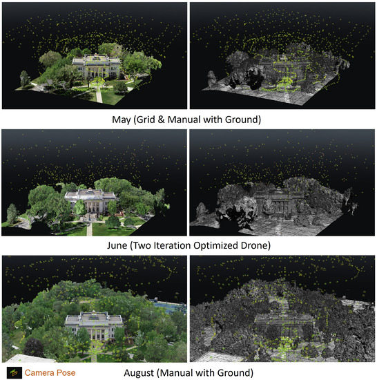 After backing up each day’s photos and data, the team renamed photos and began photo editing in Adobe Lightroom to reduce shadows, match exposures, and fix color temperature differences; a common practice that has been conducted in multiple other photogrammetry studies [85,86,87]. These edits allow for more data and tie points to be pulled from underexposed regions of photos and for the model to be more complete and visually appealing (see Figure 9). Raw (DNG and CR2) photos taken from the ground cameras benefited most from this treatment though the JPEGs used with the drone were edited as well. All photos were exported after edits to the highest quality/lowest compression JPEGs for processing which aligns with Alfio et al. [88] in their study on how photo format influences model accuracy, which concluded that JPEGs with minimal compression (level 12) were the best format to use in photogrammetric 3D model reconstruction. While working on photos, the team ran preliminary alignments to see if the captured data were adequate for satisfactory model reconstruction. The team had the benefit of gathering data in a local area where they could easily return. When gathering data in distant regions, the same capability to run sparse models and check for adequate data in the field could be an avenue of future research.