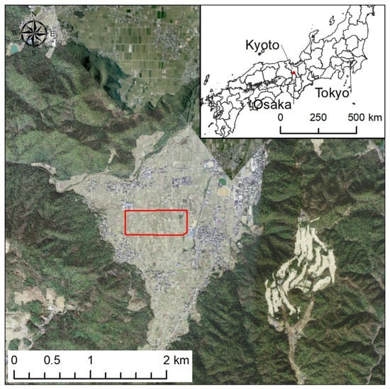 The study area was approximately 26 ha in Sogabe, Kameoka City, Kyoto Prefecture, Japan (Figure 1). Small-scale, irregularly shaped rice paddies have been preserved in the study area. In addition, stone masonry, earthen canals, and dug-up canals are present. In Kameoka City, the national Kameoka Central Agricultural Land Improvement Project is underway, and the surveyed area is included in the Sogabe construction area where construction began in 2018. The surveyed area is adjacent to the farmland before and after the field improvement.