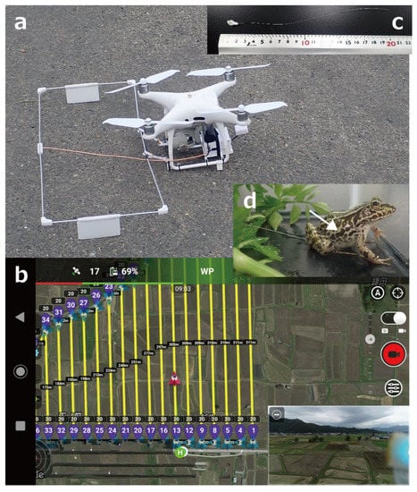 Drone-Radiotelemetry System for detecting and tracking the movement of small amphibians, such as frogs. (a) Receiver and antenna mounted on the Phantom 4 pro. (b) Automatic navigation by the Litchi application and LED lights are captured by the camera to confirm radio waves received during flight. (c) Radio transmitters (Nanotag). (d) Frog with nanotag inserted.