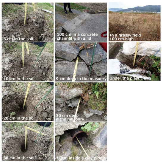 We selected and validated the locations where frogs are likely to enter in paddy fields. The locations which can be detected consistently are 5 cm deep areas in the soil, gaps in masonry, under plastic bags, whereas locations where detection may not be stable are areas deeper than 5 cm in the soil, covered concrete channels, and grass. If we apply these results to the ecology of frogs living in paddy fields, we can assume that frogs cannot be detected when (1) they are hibernating deep in the soil, (2) they have been washed away in a covered concrete channel, or (3) they are in a fallow field with high vegetation. If they can be detected, their positional accuracy may decrease. Even with radiotelemetry, radio waves are reflected and attenuated by rocks and soil, making it difficult to locate them [16]. These results suggest that when detecting and tracking the movement of frogs living around paddy fields, with high spatial and temporal resolutions, detection may be interrupted depending on the location of the frogs.