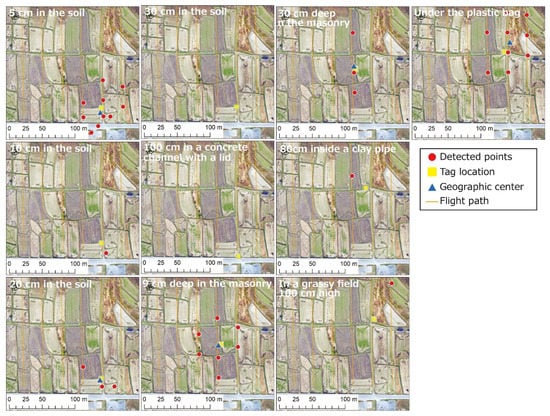 The detection results for each location are shown in Table 1. The nanotag locations, detection points, and geographic centers are shown in Figure 4. In the soil, the number of detections was high at 5 cm, but decreased at 10 cm and above. At 30 cm, it was undetectable. No detection was made in the covered concrete channel. The number of detections in masonry decreased as we moved deeper into it. Inside the earthen pipe, the number of detections was one. In a grassy area with a vegetation height of 1 m, the number of detections was one. The detection point was 61 m away from the nanotag location. Under a plastic bag, the number of detections was high, and the tag was detected in all directions of the nanotag location. The average distance between the detected points was received and the nanotag location was 32 m when the number of detections was two or more. The average distance between the geographic center and the nanotag location was 35 m for one detection and 7 m for two or more detections.