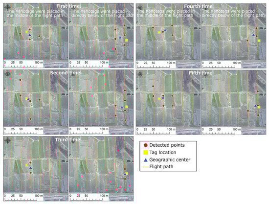 The detection results of multiple flights are shown in Table 2, and the nanotag locations, detection points, and geographic centers are shown in Figure 5. The number of detections varied from 2 to 6, depending on the flight times. The average distance between the nanotag location and the detected points was 29 m for tag ID 162 and 30 m for tag ID 46. The mean distance between the geographic center and the nanotag location was 16 m for tag ID 162 and 12 m for tag ID 46. The difference between the aggregate values directly below the flight path (tag ID 162) and in the middle (tag ID 46) was less than 4 m.