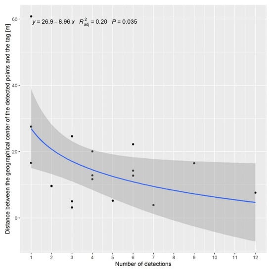 We showed the relationship among the distance between the geographic center, the nanotag location, and the number of detections in a scatter plot, fitted a logarithmic regression equation, and illustrated the 95% confidence range (Figure 6). The detection number 1 had an outlier (61 m). The distance between the geographic center and the nanotag location was long. As the number of detections increased, the distance between the geographic center and the nanotag location became shorter. The distance was less than 20 m for three or more detections.