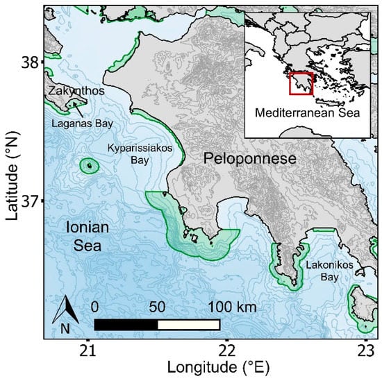 This study was conducted in western Greece (Zakynthos Island and the Peloponnese), which is situated in the Ionian Sea of the Mediterranean Sea (Figure 1). The Ionian Region encompasses at least 30 NATURA 2000 marine habitats [], of which nine fall within our study area (Supplementary Materials Figure S1), including two managed national parks (National Marine Park of Zakynthos and Kotychi–Strofylia Wetlands National Park). In the Mediterranean, loggerhead sea turtles were recently listed as of least concern in the IUCN Red List of Threatened Species [], due to positive trends in nest counts through focused conservation effort over the last 2–3 decades []. The study region encompasses a number of diffuse (<20 nests/season) to moderate rookeries (20–100 nests/season), and three major rookeries (>100 nests/season) where loggerhead sea turtles aggregate. The three major rookeries include Zakynthos (Laganas Bay; 1244 nests/season), the southern part of Kyparissiakos Bay (621 nests/season), and Lakonikos Bay (197 nests/season) [] (Figure 1), representing 59% and 29% of nesting activity per season in Greece and the Mediterranean, respectively []. This region is at the latitudinal limits of the breeding range for loggerhead turtles globally [,]. Consequently, there is a very narrow window of opportunity for breeding [,,], with temperature constraining the rate of egg maturation in females occupying coastal waters before each nesting event [,] and the viable incubation period of clutches on beaches []. Based on published data from Zakynthos Island, mating activity generally peaks in late April to mid-May, with females generally nesting from late May to early August, with peak nesting activity occurring in late June to early July []. Males generally depart the breeding grounds for foraging grounds (up to 1000 km distance) in late May, while females generally depart in early August, and they remigrate to breed at 1–2 and 1–3 year intervals, respectively [].