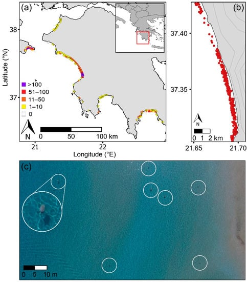 Between 2016 and 2019, inwater UAS surveys were conducted along ~620 km coastline of the western Peloponnese (Kato Korogona, 36°38′ N, 22°52′ E; to Kalogria, 38°09′ N, 21°21′ E) and Zakynthos Island (37°41′ N, 20°52′ E to 37°44′ N, 20°55′ E). The UAS was flown in accessible areas generally fronting sandy beaches. In 2019, UAS surveys were conducted systematically across the entire region in May, which represented the key mating period of sea turtles [,], and late June/early July, which represented the peak nesting period of female turtles []. During the second survey period, beaches were also surveyed for evidence of the tracks of turtles. A DJI Phantom 3 Professional™ (Shenzhen, China; http://www.dji.com; accessed on 18 November 2021) UAS was flown at 60 m altitude (allowing a 100 m wide field of view), with 100 m intervals up to 400 m offshore (Figure 2c). We previously confirmed <2% error rate by independent observers for this altitude in our study region, with it being possible to detect sea turtles to seabed depths <7 m (with all surveys being conducted within this seabed depth range) and distinguish adults and juveniles []. Data were recorded in video format (3840 × 2160 pixels). All data were extracted using web-based software (AirData UAV™). For additional details, see [].