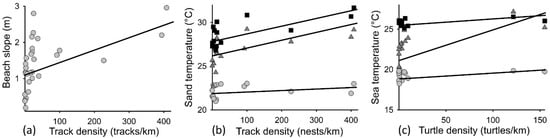 Associations detected between: (a) beach slope and turtle track density at each surveyed site (tracks/km); (b) mean sand temperature (°C) and turtle track density at each surveyed site (tracks/km); and (c) mean sea temperature and in-water turtle density at each surveyed site (turtles/km). Track density and turtle density reflect the maximum track/turtle density recorded at each surveyed site during the peak nesting period (May = grey circles; June = dark grey triangles; July = black squares).