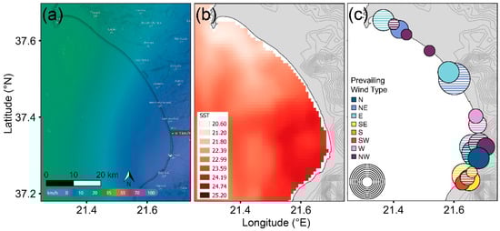 Examples of (a) offshore prevailing NW wind with sheltered area (purple shading; source: windy.com; accessed on 24 November 2021) and (b) skin sea surface temperature [] in Kyparissiakos Bay, Greece, on 27 June 2020. (c) Distribution and frequency of sheltered sites for the eight key wind directions (e.g., N, NE, E, etc.) from May to September 2020. The circles represent 10–20 (striped fill) and 20–35 km/h (solid fill) winds, with 10% increments in size ranging from 1–10% circles to 71–80% circles.