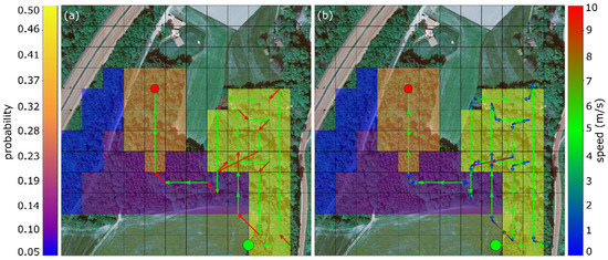 Probability map of a practical search and rescue scenario considered in [15]. The potential field algorithm is used for path planning, as explained in [15]. (a) Ignoring acceleration/deceleration leads to an unrealistically short flight path and time of 1291 m and 225 s. (b) Considering acceleration/deceleration increases path-length and flight-time to 1489 m and 380 s, respectively. Start point (green circle), person found (red circle), detection probabilities (colors of cells), drone speed (colors of path segments). The axillary acceleration/deceleration trajectories are the segments that gradually change colors in (b). Each cell is 30 m × 30 m. The search area covers 6.3 ha.