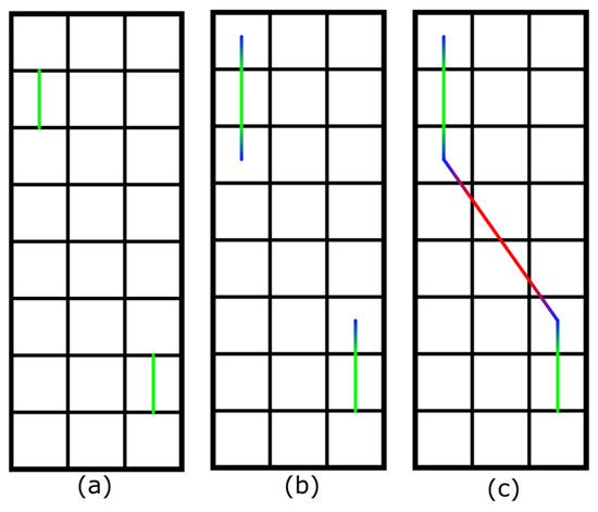 Trajectory planner ensuring constant velocity for scanning over the desired scan cell ((a), here top left cell is visited first followed by the bottom right cell). Additional acceleration/deceleration path segments generated on both sides of the scan cells (b). Direct line segment in-between scan cells are flown with maximum flight speed (c). Colors indicate velocity (blue to red = slow to fast).