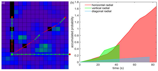 Radial Gradient Accent: (a) Three sample radials for a probability map and (b) their corresponding APT plots. Cell colors in (a) indicate probabilities (as in Figure 2). Black cells are previously visited cells. Green dot and red dots indicate current cell and end points of radials. Colors of trajectories indicate flight speed (as in Figure 2): scan speed (green line segments), max. flight speed (red line segments), acceleration/deceleration (blue line segments). Only cells with the centers located on the corresponding radial are considered for scanning. In this example, the horizontal radial is chosen next as it has the highest APT gradient (b).