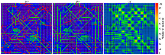 Potential Field. (a) Planned trajectory including scan legs without considering acceleration/deceleration. (b) Planned trajectory considering acceleration/deceleration. (c) Coverage map showing how many images of a certain region have been sampled. The starting point is indicated with the green dot.