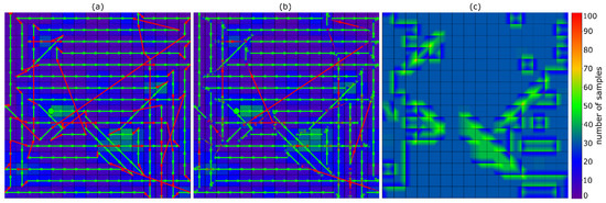 Figure 2 illustrates, for the same probability map as used in [15], the difference in potential-field-based adaptive path-planning when acceleration/deceleration is ignored (Figure 2a), as it was the case in [15], and when it is considered (Figure 2b). With our drone prototype (a 4.5 kg MikroKopter OktoXL 6S12, measured average acceleration/deceleration of 1.4 m/s2, a scan speed of 5 m/s, and a maximum flight speed of 10 m/s) and for a 6.3 ha search area, a flight path of 1291 m and a total of 225 s flight time was determined until the target person is found for constant flying speed (i.e., ignoring acceleration/deceleration). In practice, however, this does not hold because the acceleration/deceleration trajectories are ignored. Considering them as explained above results in a 1489 m long flight path and in a flight time of 380 s instead (an increase in required flight time by a factor of 1.7).