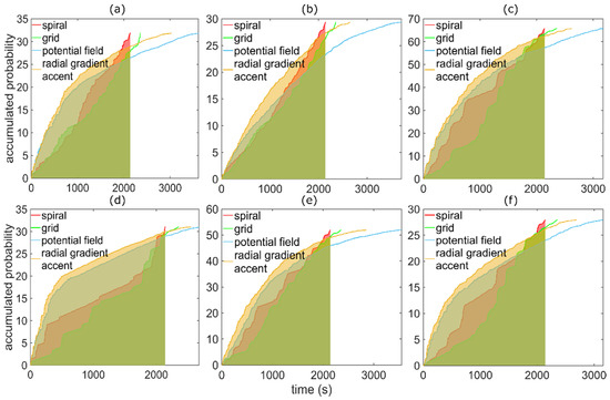 Accumulated probability w.r.t time (APT) plots for different probability maps. (a) scattered, (b) scattered-smooth, (c) exponential, (d) multiple-patches, (e) large-patch, (f) small-patch. The filled areas indicate the integrals up to the shortest full coverage time.