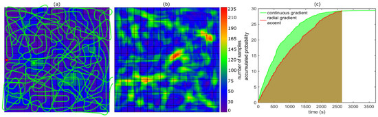 Constant-velocity assumption. (a) Planned trajectory with constant velocity and smooth heading changes. (b) Coverage map showing how many images of a certain region have been sampled. (c) Accumulated probability w.r.t time (APT) plots for acceleration-driven path planning (RGA) and constant-velocity-based path-planning (continuous gradient). The starting point is indicated with the green dot.