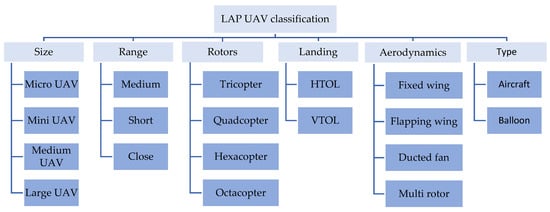 Figure 1 categorizes UAVs into the LAPs category based on their type, size, range, and type of rotors. Figure 2 shows the shape and form of three kinds of commercialized UAVs: a rotary-wing drone (Figure 2a), a fixed-wing drone (Figure 2b), and a fixed wing hybrid VTOL UAV (Figure 2c).