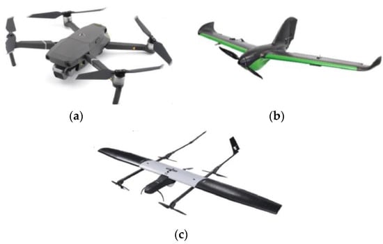 Examples of several types of UAV: (a) rotary-wing drone, (b) fixed-wing drone, (c) fixed-wind hybrid vertical take-off and landing (VTOL) drone (modified from [19]).