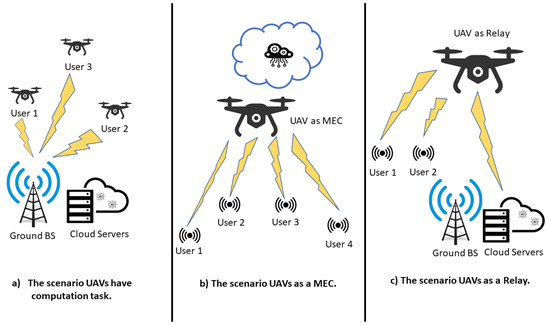 The UAV may be regarded as a specific user that could offload those computing tasks exceeding its memory and processing capacity to a MEC server, as shown in Figure 4a. UAVs typically have limited battery capacity and insufficient memory and computing power to execute complex computational tasks. As a result, offloading their processing to the ground MEC server for computation may increase its battery life. In another situation, as shown in Figure 4b, the UAV may keep the MEC server on board and fly to assist the ground-based users with the task of computing once the ground-based users offload their computation responsibilities to the latter. In the third scenario depicted in Figure 4c, the UAV serves as a central relay, assisting mobile users to offload their computing tasks to a specific MEC server.