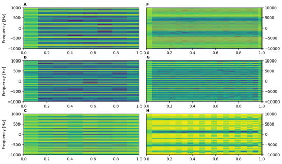 Figure 1 shows a long-window STFT spectrogram for each of the five drones outlined in Table 5. The signals were produced using radar parameters with the X-band (left column) and W-band (right column). For demonstration purposes, these signals have no augmentation. Notice the unique HERM line signature, or bands, within each spectrogram. These signatures are not an exact representation of the drones, but the important fact is that they are distinct from one another—just as we would expect in practice. Furthermore, these spectrograms would be easily identifiable by a convolutional network. We will investigate whether this remains true for signals that have undergone the previously discussed augmentation.