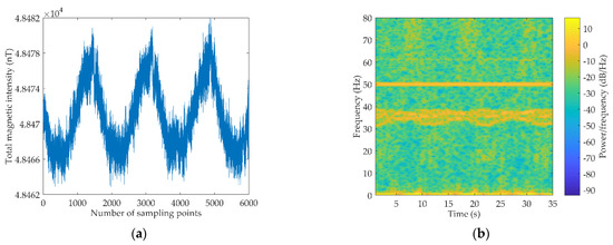 Data containing 6000 sampling points can be obtained after the UAV maneuvers back and forth along a preset path; the flight altitude of the UAV is about 20 m. The original data and its time-frequency spectrogram after DC component removed are shown in Figure 3.