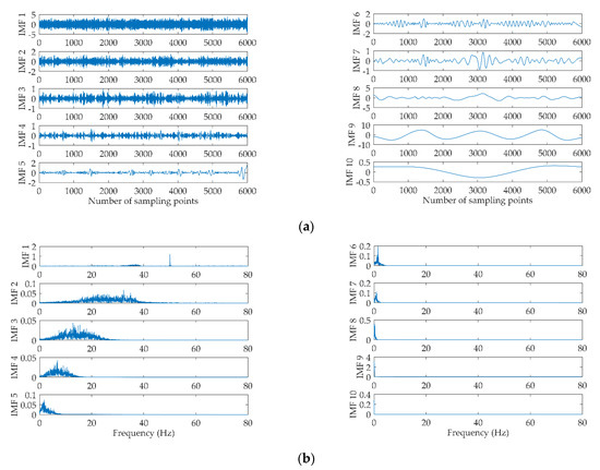 (a) The 10 IMFs obtained by EMD; (b) The corresponding spectrum of the 10 IMFs.