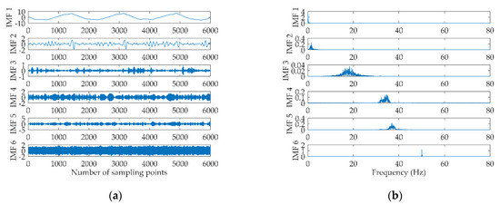 (a) The 6 IMFs obtained by VMD; (b) The corresponding spectrum of the 6 IMFs.