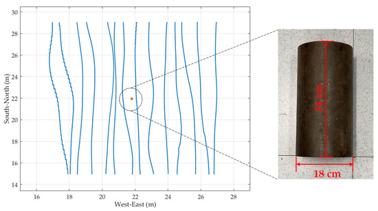 The field experiment was conducted in Hunan Province, China, on 12 October 2021. A cylindrical steel pipe is buried in the center of the survey area, with a depth of about 0.58 m. The pre-programmed flight profiles run along the north-south direction, with a line spacing of 0.75 m. The actual flight trajectory and the relative position of the target in the survey area are shown in Figure 6; due to the influence of crosswind, the actual line spacing is 0.2–1.2 m. The flight altitude of the UAV is 2 m, with an airspeed of about 2 m/s.